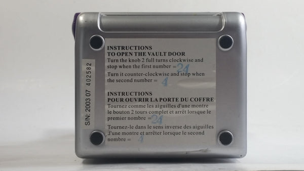 Missing the locking door and the back has a crack in the plastic. The base contains the original safe combination however it serves no purpose without the door. It turns on and makes sounds and all of the buttons and features on the digital screen work. View photos.