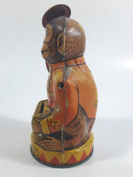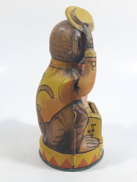 Antique 1930s J Chein Circus Monkey "Thank You" Tin Litho Metal Coin Bank - Salutes with Coin - Working - 6" Tall