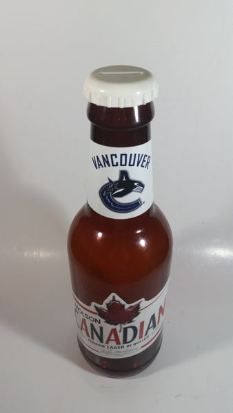 Molson Canadian Beer NHL Ice Hockey Vancouver Canucks 14" Tall Large Brown Plastic Bottle Shaped Coin Bank Sports Collectible