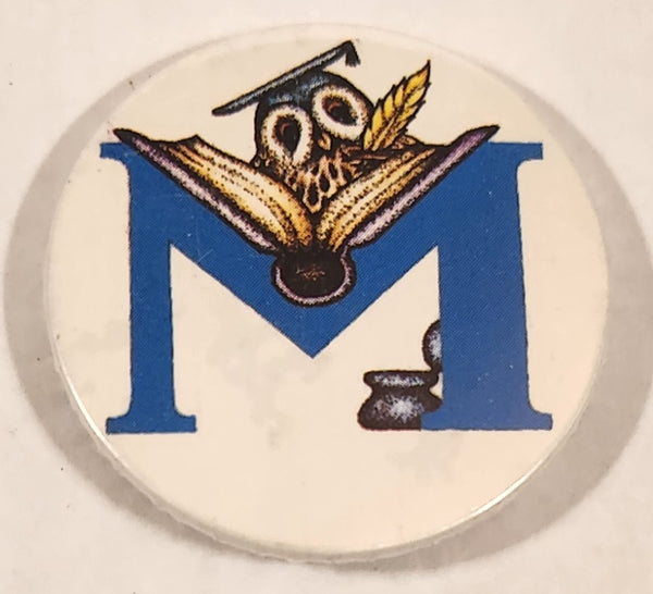 Blue M with Owl Wearing Graduation Cap Reading A Book Montessori School 1 1/2" Round Button Pin