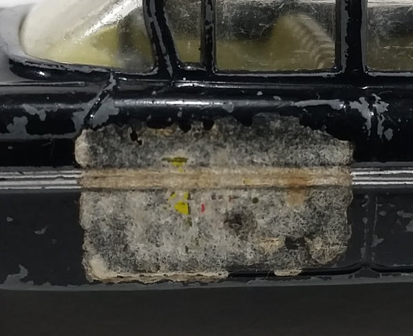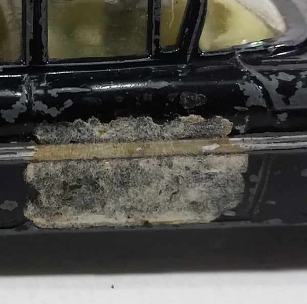 Missing rear passenger tire, the hub is still there. All wheels spin. General paint wear, some wear on the windows, and the sticker is no longer legible.