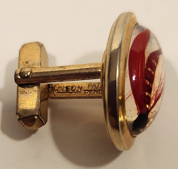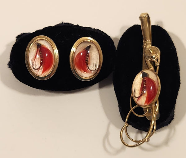 Vintage Anson Fly Fishing Red Fly Glass Gold Tone Cufflinks and Tie Clip Set