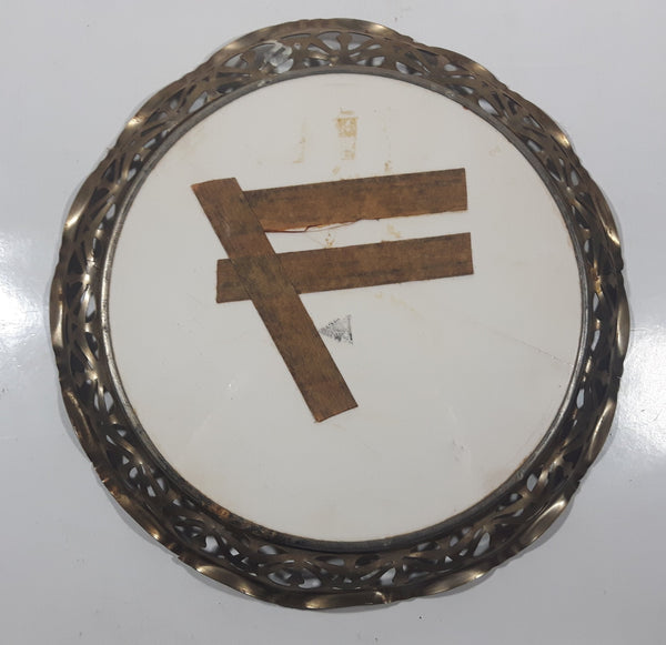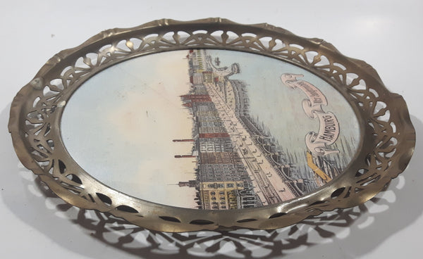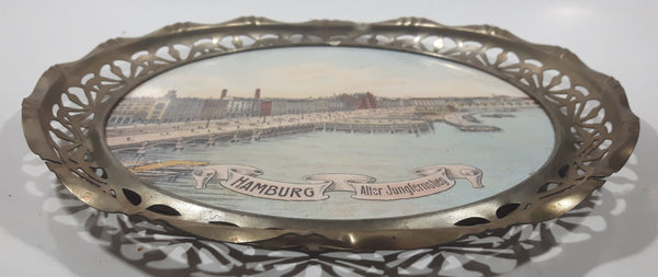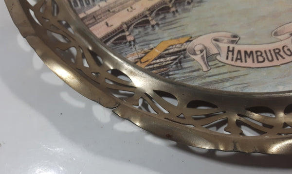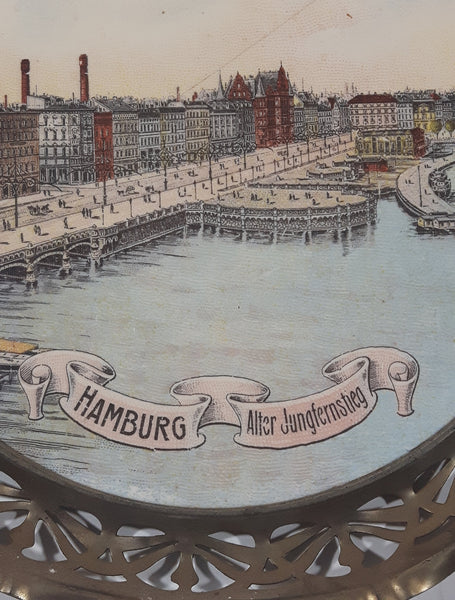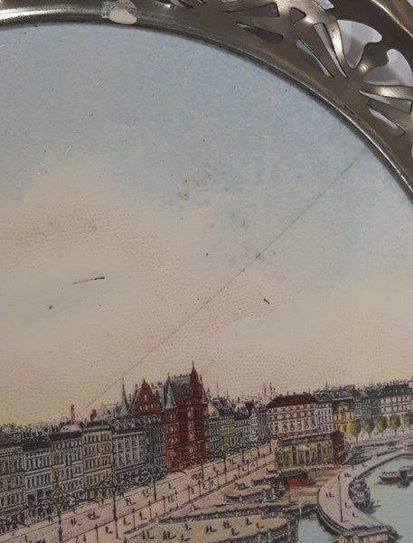 Rare Antique Early 1900s Hamburg Alter Jungfernstieg 10" Porcelain Ceramic Plate with Silver Tone Ornate Metal Frame