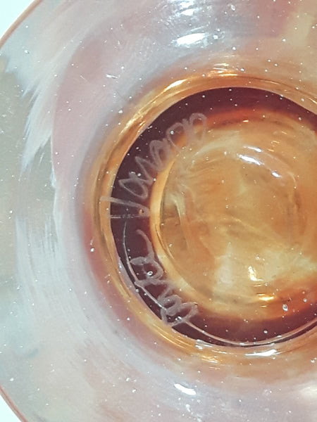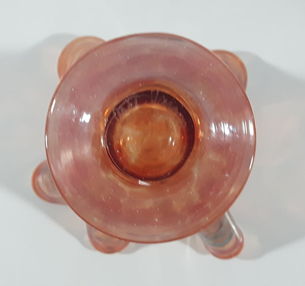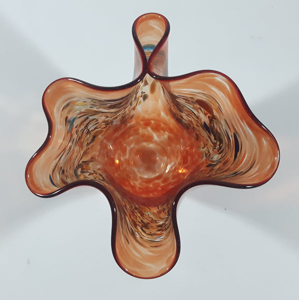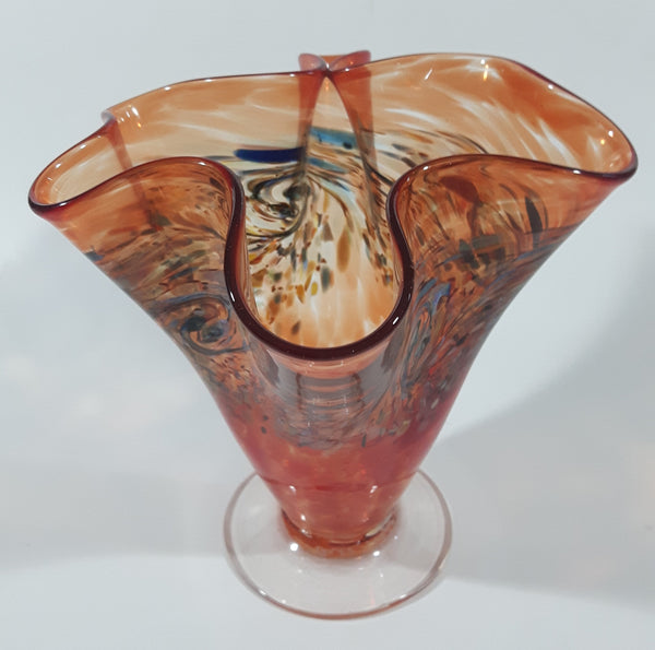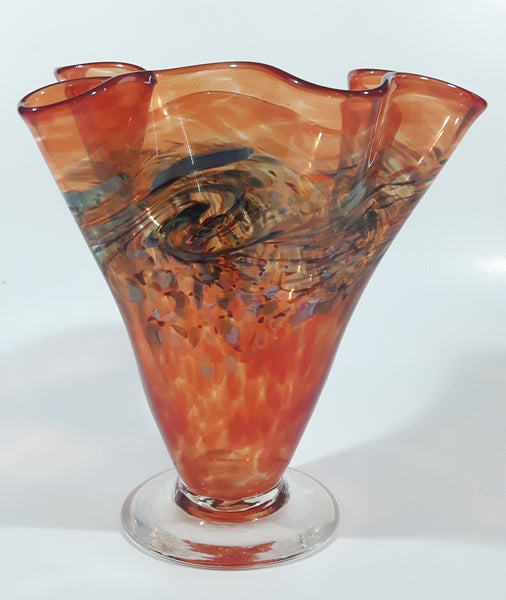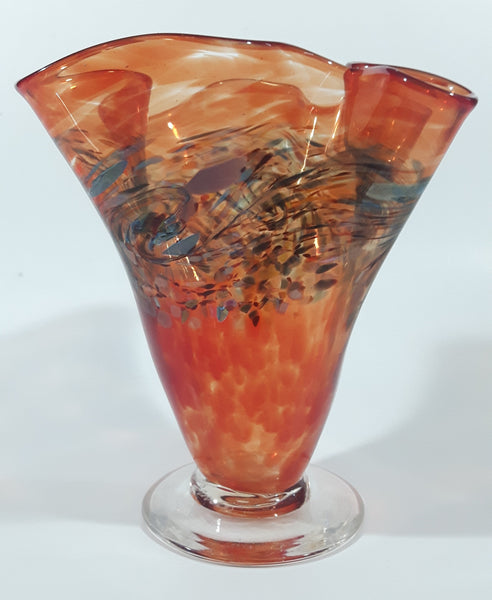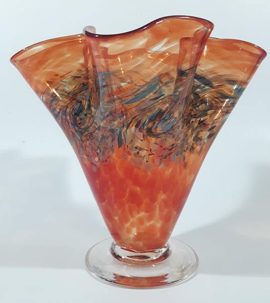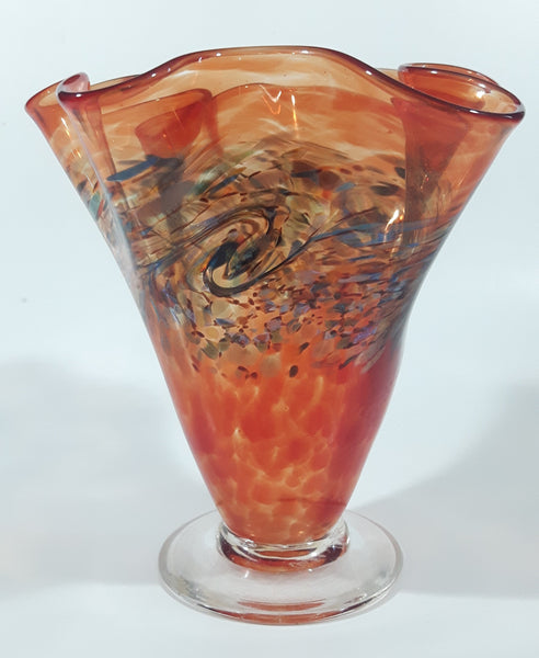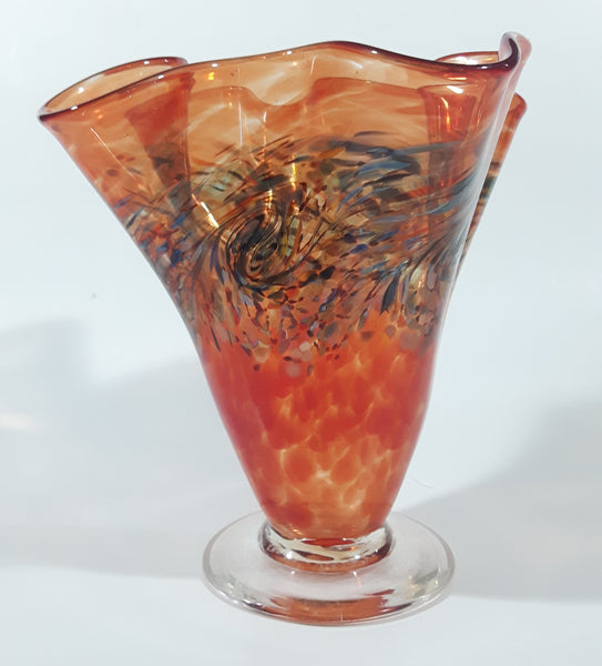 Arte Vargas 6062 Orange with Blue Swirls Frilled Pinched Edge 6" Tall Hand Blown Art Glass Vase Signed