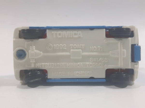1992 Tomy Tomica No. 71 Mitsubishi Minica Toppo Diving School Blue 1/56 Scale Die Cast Toy Car Vehicle