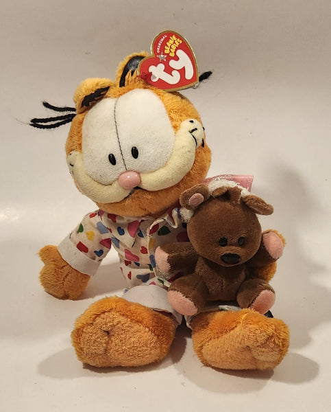 2005 Ty Beanie Babies Paws Garfield Holding Pooky Teddy Bear in Heart Pajamas 9" Tall Toy Plush Stuffed Character with Tag