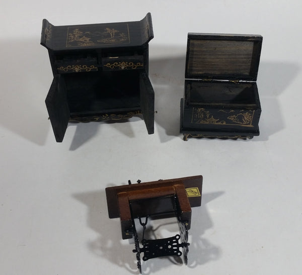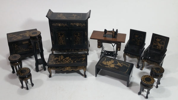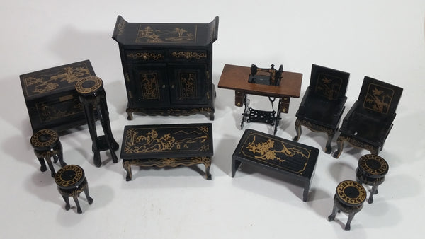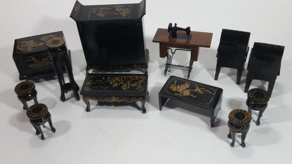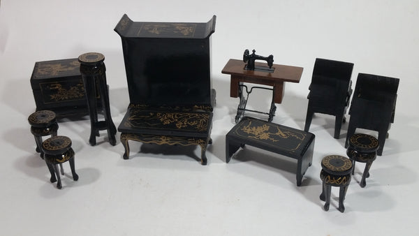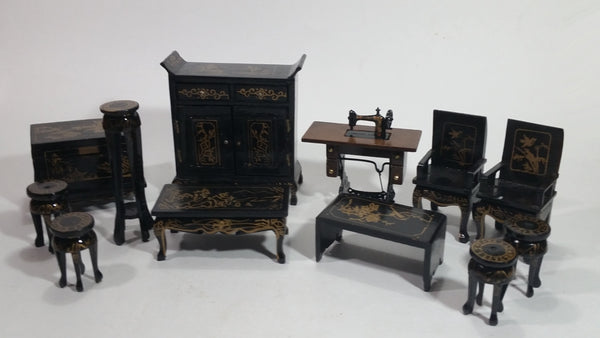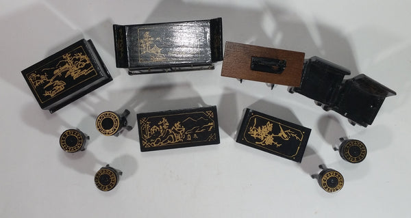 Vintage Japanese Hina Black Lacquered Hand Made Hand Painted Miniature Wood Doll Furniture Lot of 12 Pieces