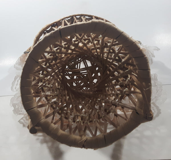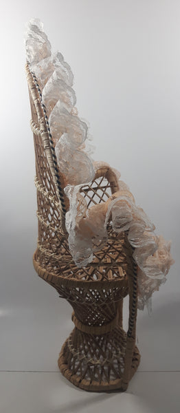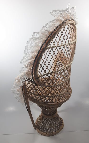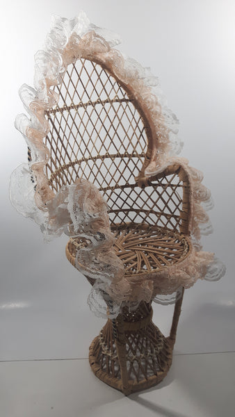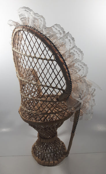 Vintage Wicker Rattan Fan Back Peacock Style 16 1/4" Doll Chair with Lace Trim