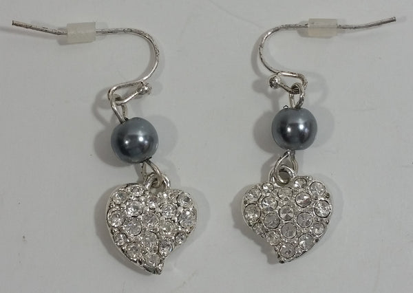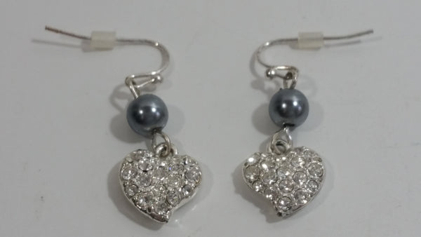 Satin Blue Pearl Clear Rhinestone Encrusted Heart Shaped Dangle Earrings