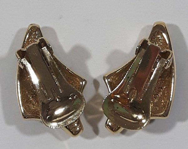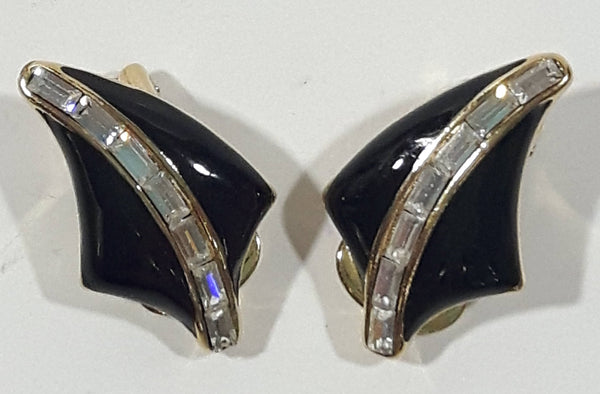 Vintage Black Enamel Rectangular Cut Clear Gemstones Gold Tone Clip On Earrings