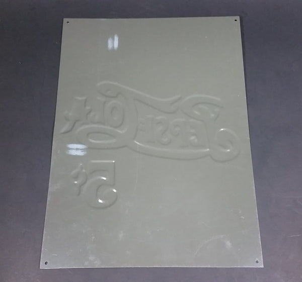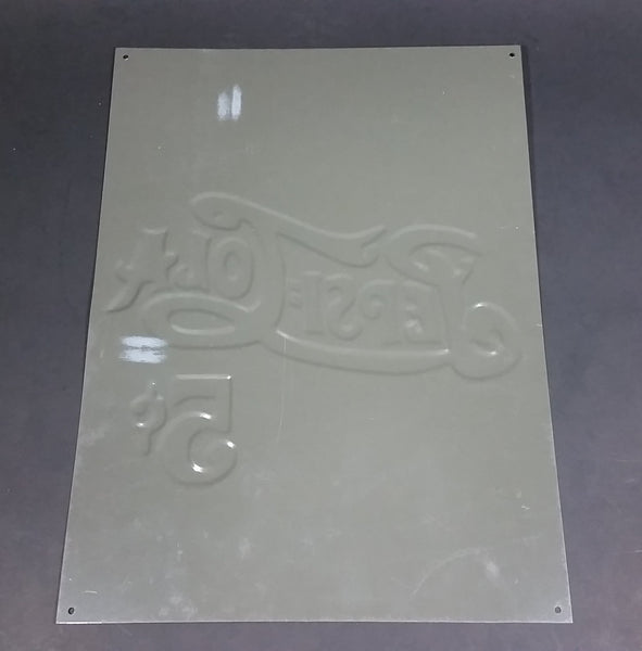 Excellent condition with 1 tiny scratch mark and some edge wear at the bottom. Four pre-drilled holes. The lettering of Pepsi-Cola and 5¢ is raised (Embossed). The edges of where the coloring meet have a slight ridge so it appears to have been silk screened.
