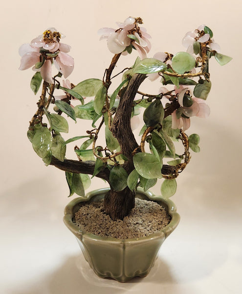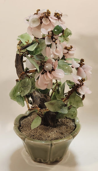 Vintage Chinese Art 12 1/2" Tall Pink Cherry Blossom Green Glass Jade Tree Ceramic Planter Fake Plant Sculpture
