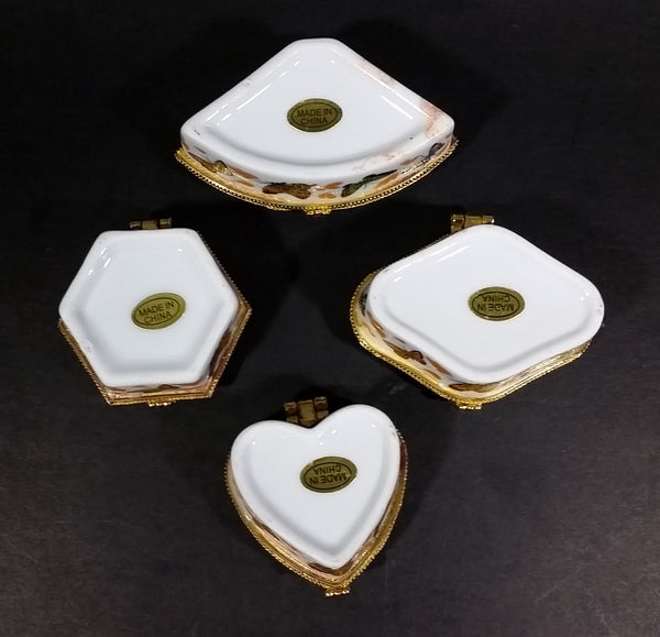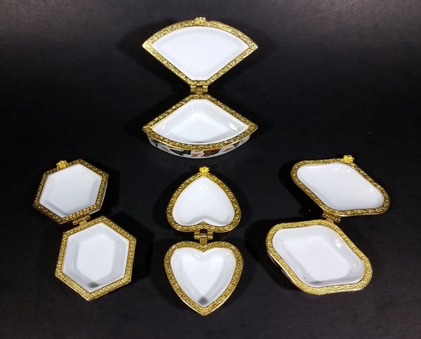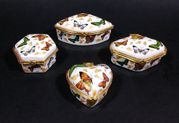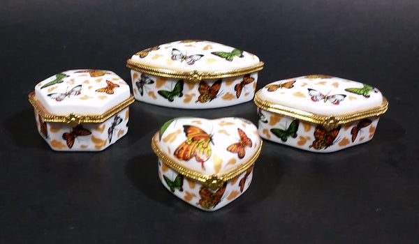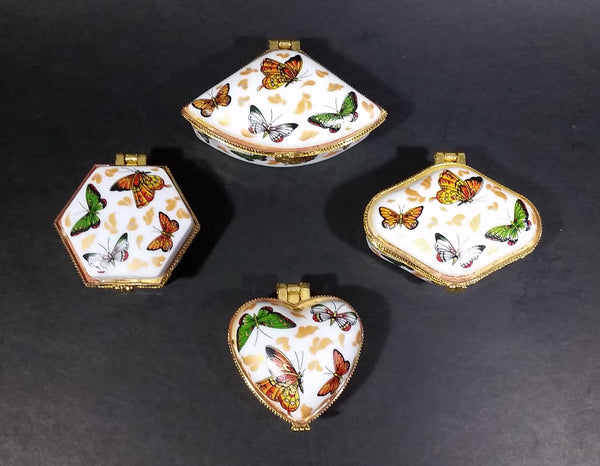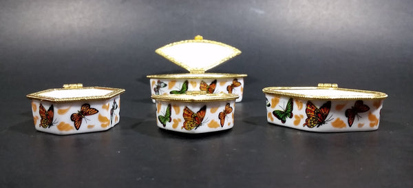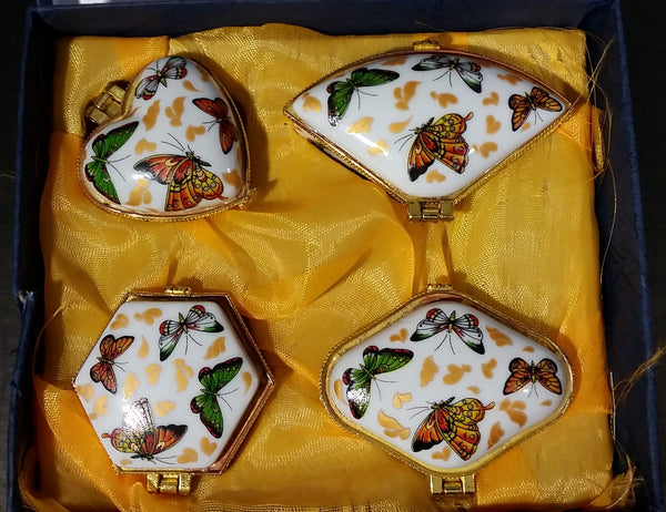 Set of Butterfly Ceramic with Gold Trim Hinged Trinket Jewelry Boxes in Box - Heart, Clam, Hexagon, Diamond