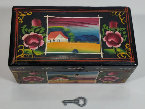 Vintage Hand Painted Farmhouse Scenery and Flowers Black Wood Locking Jewelry Box with Key