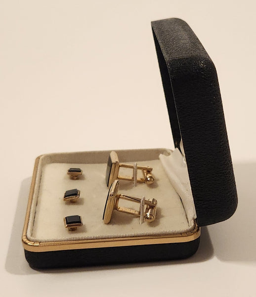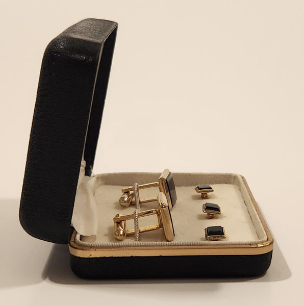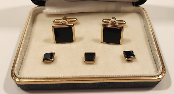 Vintage Formal Wear by John Forsyth Black Resin Square Gold Tone Cufflinks and Tie Tack Studs In Case