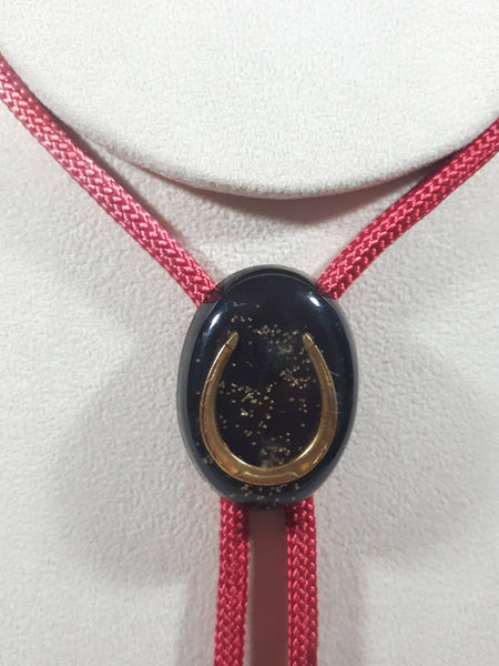 Western Gold Horse Shoe in Black Oval Red Draw String Bolo Tie