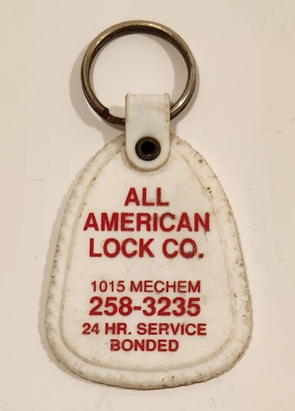 Vintage All American Lock Co. 1015 Mechem 24 Hr. Service Bonded White Plastic Fob Keychain Ring