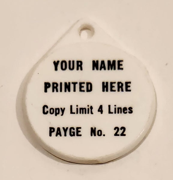 Vintage Salesman Sample Payge No. 22 Your Name Printed Here Copy Limit 4 Lines White Plastic Fob Keychain