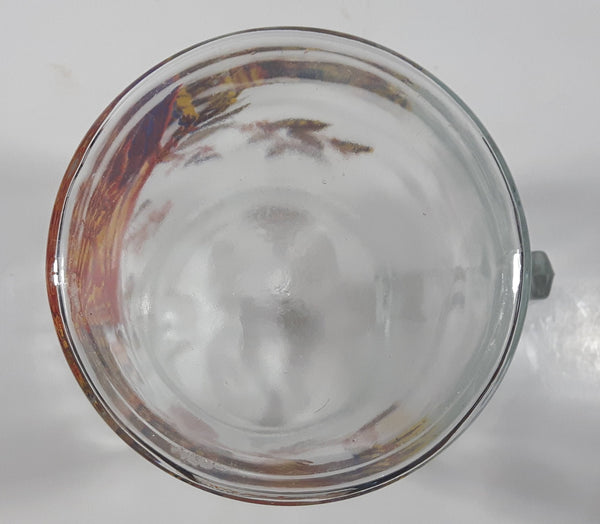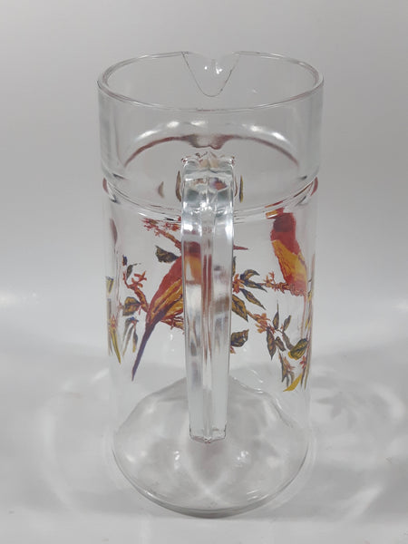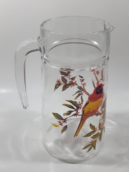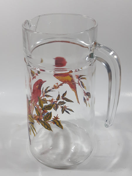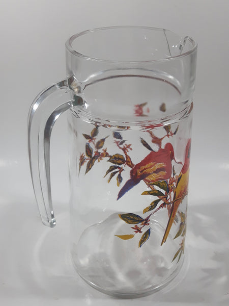 Vintage Red Yellow Blue Birds on Branches 8 1/4" Tall Clear Glass Pitcher Jug Made in France
