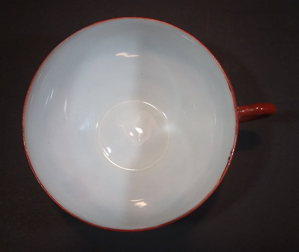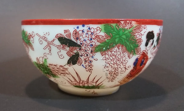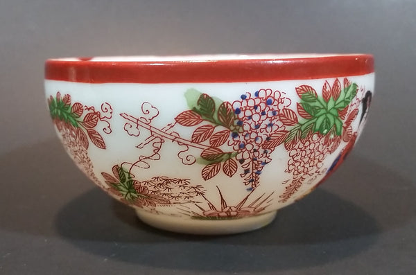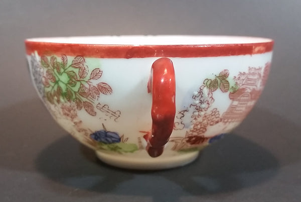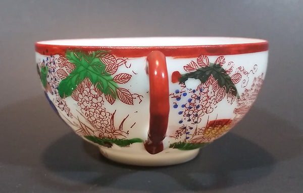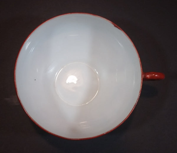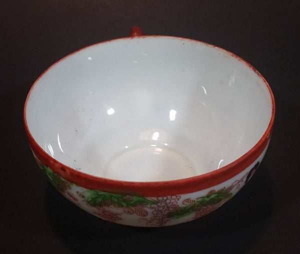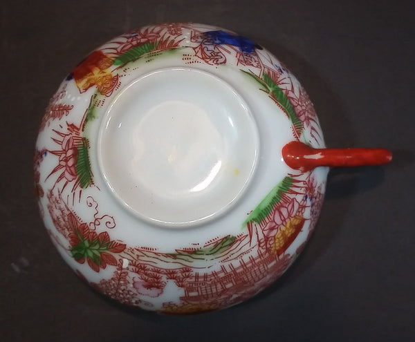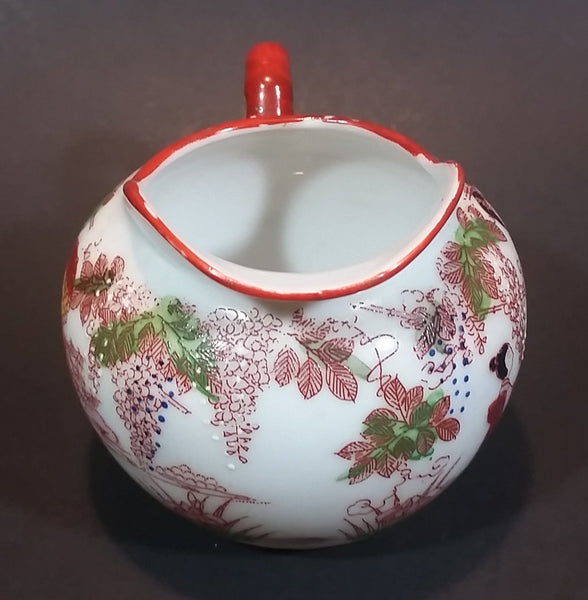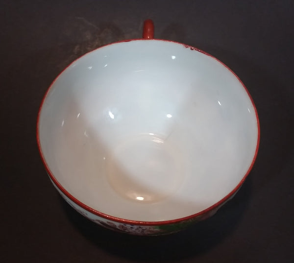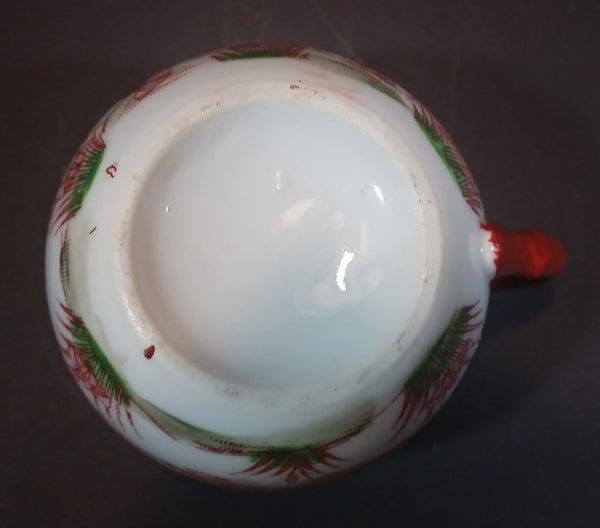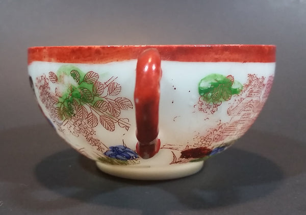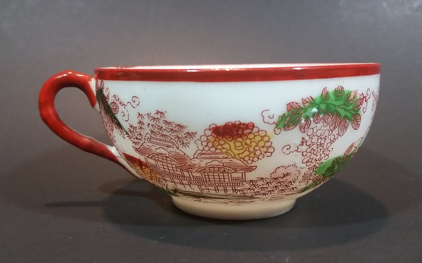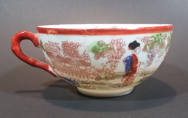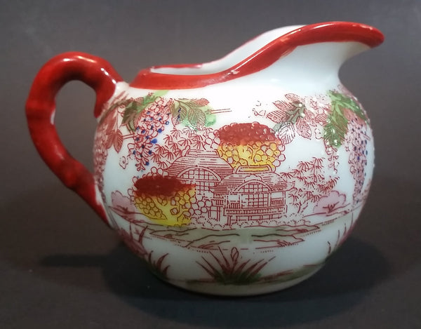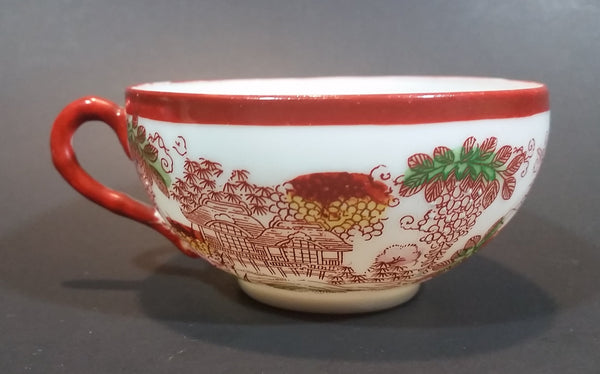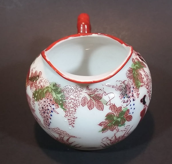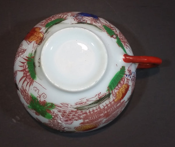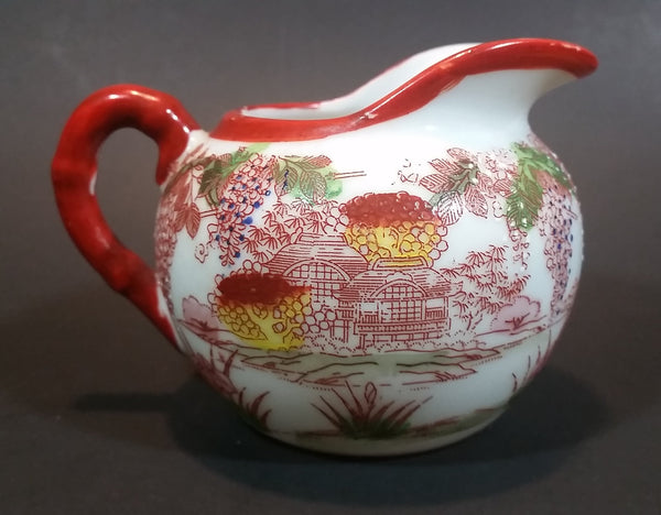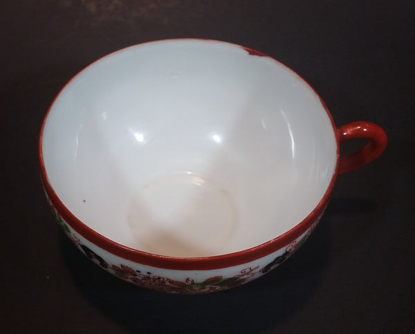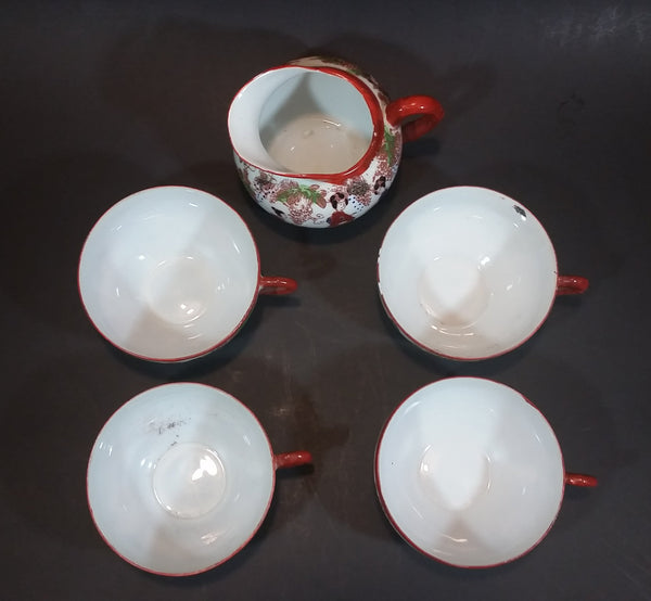 5 piece set of Kutani circa 1930 Japanese red and white thin egg shell porcelain. Consists of 1 creamer and 4 tea cups. I teacup has two tiny teeth mark size chips. 1 teacup has paint speckling inside from when it was hand painted, it adds to the beauty of it.