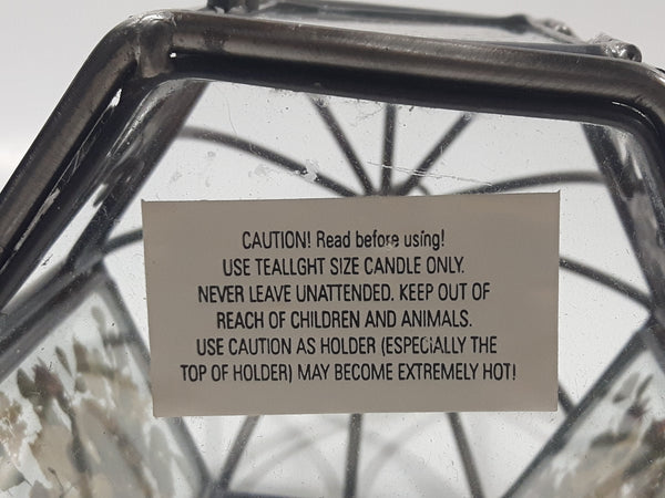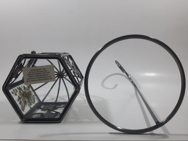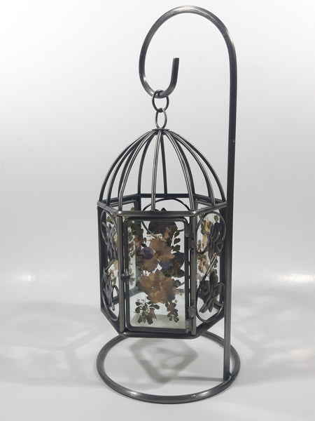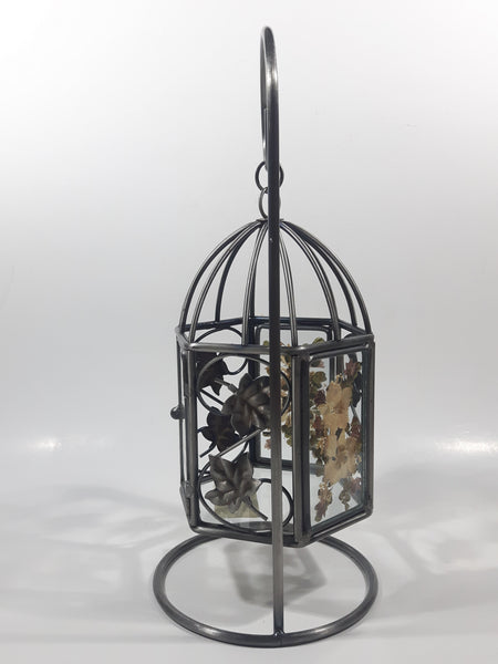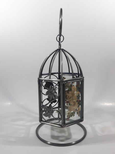 Glass Leaf Pattern Pressed Real Dried Flowers Metal Bird Cage Style Hanging Candle Holder