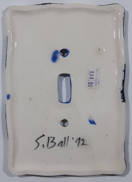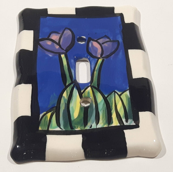 Handpainted Purple Pink Flowers Black and White Checkers Border Ceramic Light Switch Cover