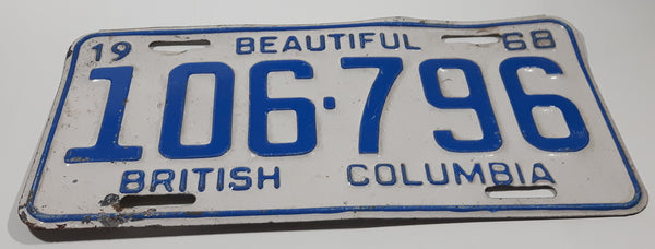 1968 Beautiful British Columbia White with Blue Letters Vehicle License Plate 106 796