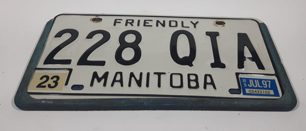 1997 Friendly Manitoba White With Black Letters Metal Vehicle License Plate Tag 228 QIA in Blue Cluthe Frame Holder