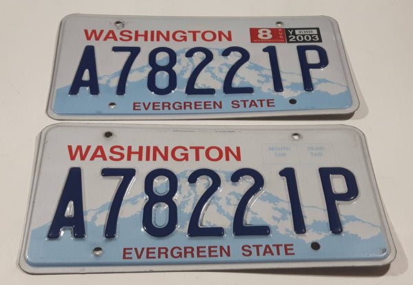 2003 Washington "Evergreen State" in Red on White and Blue Mountain Backdrop with Blue Letters Vehicle License Plate A78221P Matching Set of 2