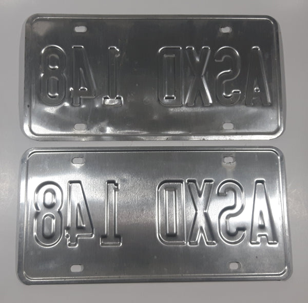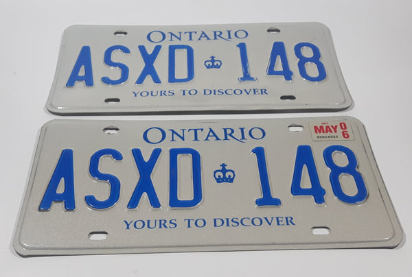 Matching Set of 2 Ontario Yours To Discover White with Blue Letters Vehicle License Plate ASXD 148