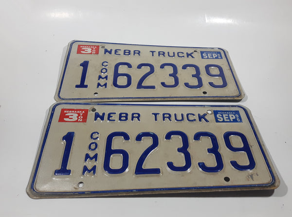 Set of 2 1996 Nebraska 3 Ton Truck Commercial White With Blue Letters Metal Vehicle License Plate Tag 1 62339