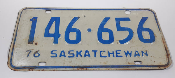 Vintage 1976 Saskatchewan Blue Lettering White Vehicle License Plate Metal Tag 146 656