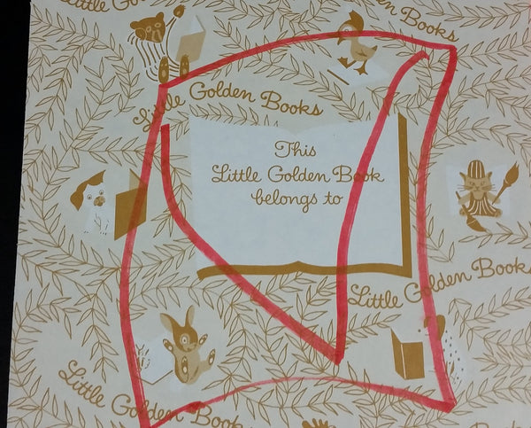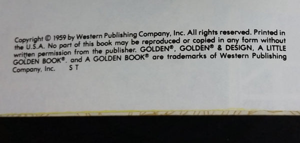 Condition: Fair. - Minimal wear on edges, crease free, corners have some wear. The spine has very minimal wear. The front inside cover has red marker over the "This Little Golden Book belongs to" section. Some soiling at the edges of the pages, the corners were folded but were unfolded see both photos. Otherwise great condition.