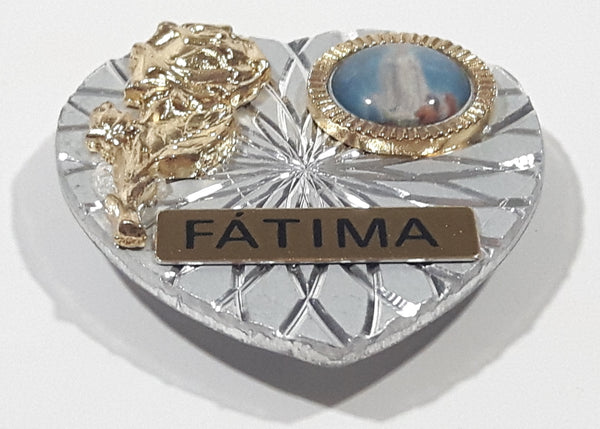 Our Lady of Fatima Gold Tone Rose Heart Shaped 1 1/4" x 1 3/8" Engraved Metal Fridge Magnet