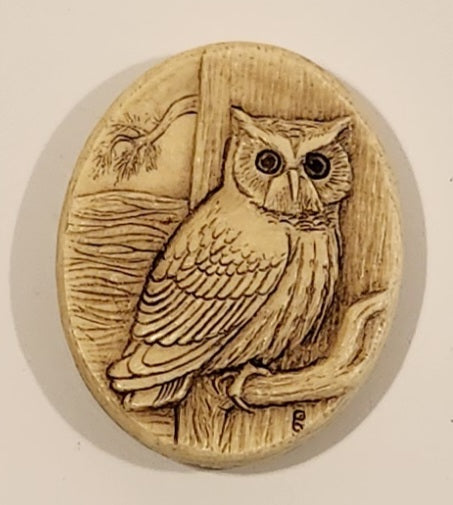 Owl Carved Bone Look White Plastic Backed Fridge Magnet Made in Canada