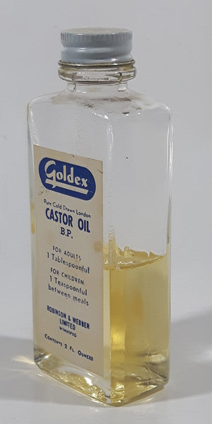 Antique Robinson & Webber Limited Winnipeg Goldex Pure Cold Drawn London Castor Oil B.P. 4 1/8" Tall 2 Fl Ounces Glass Medicine Bottle