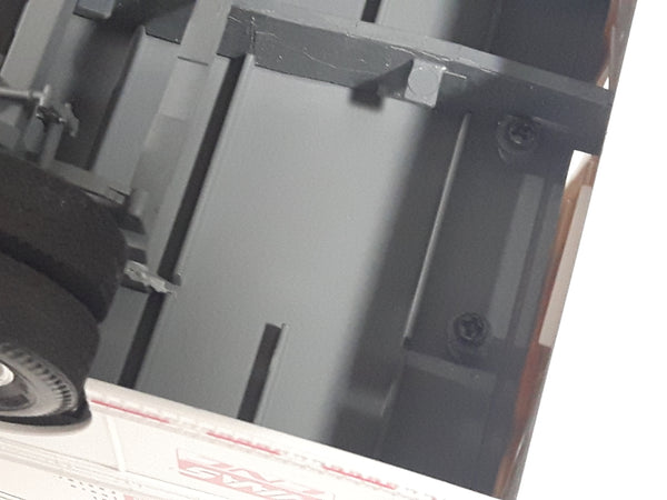 In styrofoam. No box. One of the bottom rear under rails is broken off. Very hard to find this truck. Nice size and nice graphics. View photos.