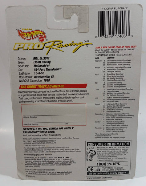 1997 Hot Wheels Pro Racing Short Track 1st Edition NASCAR #94 Bill Elliot McDonald's 1994 Ford Thunderbird Blue Die Cast Toy Race Car Vehicle - New in Package Sealed