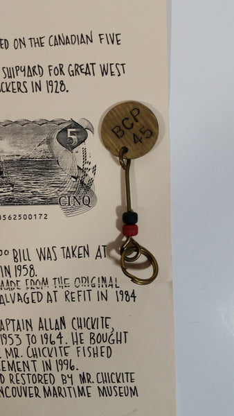 Original Piece of History Made From The Controls of The BCP 45 Boat Brass Metal Keychain from The $5 Dollar Canadian Paper Bill with Informational Paper