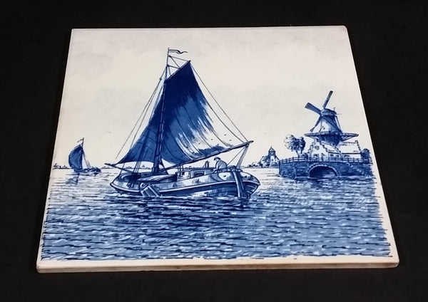 Vintage Delft Blue Sailboats and Windmills Dutch Holland Blue and White Ceramic Tile Trivet Made in Belgium