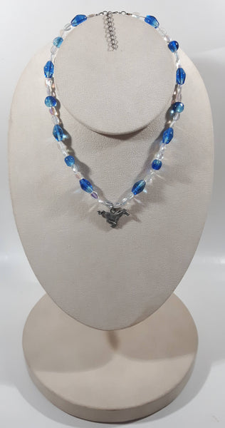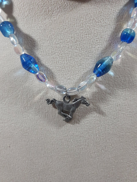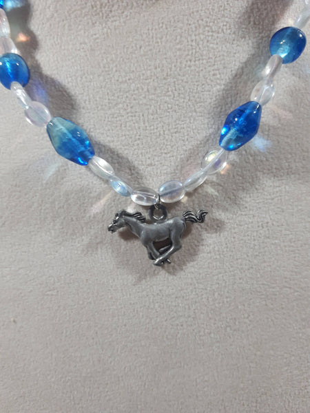 Blue and Clear Bead 16" Long Necklace with Metal Horse Pendant