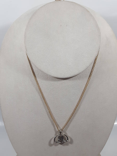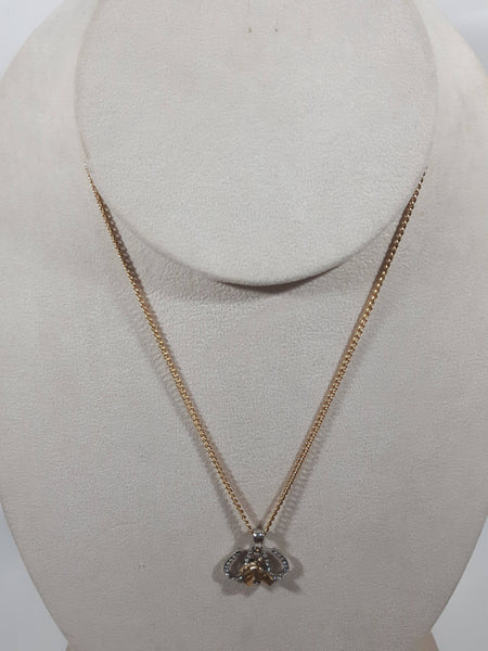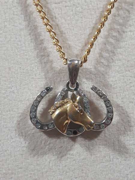 Golden Horse Head and Diamond Look Gemstone Horse Shoes Pendant 16" Long Gold Tone Metal Chain Necklace Missing Two Stones