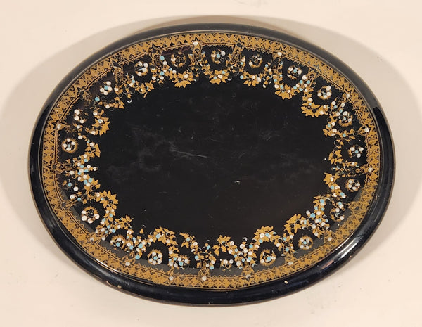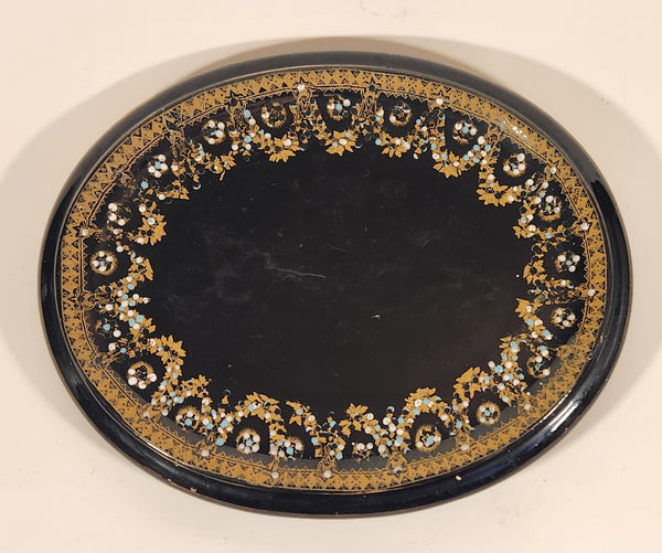 Antique 1800s Victorian Ornate Gold Pattern with Hand Painted Blue and White Dots No. G11 Black Oval 6 3/4" x 8 1/2" Papier Mache Mirror Plaque