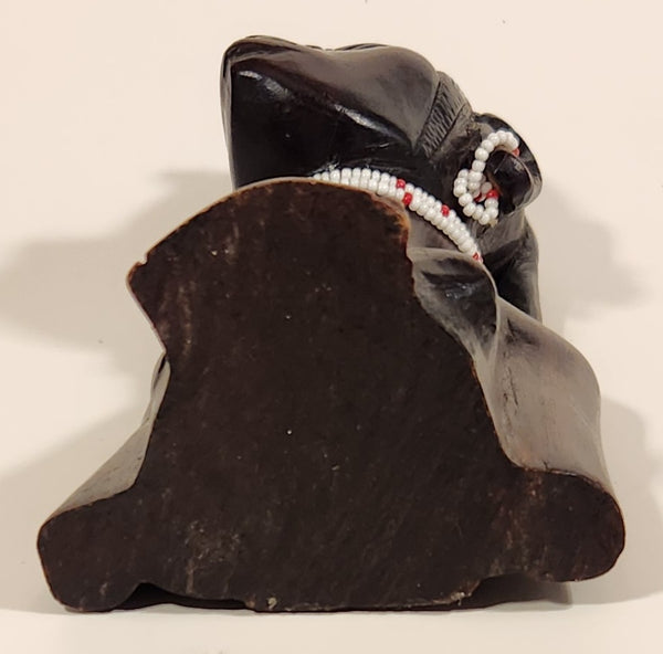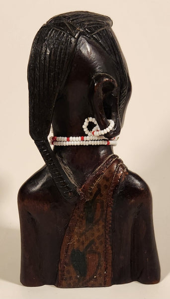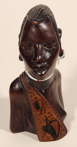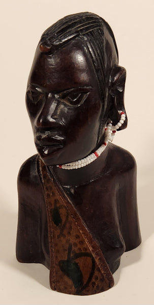 Vintage Hand Carved Masai Tribe Woman Head Bust with Beaded Necklace and Earrings 6" Wood Carved Statue