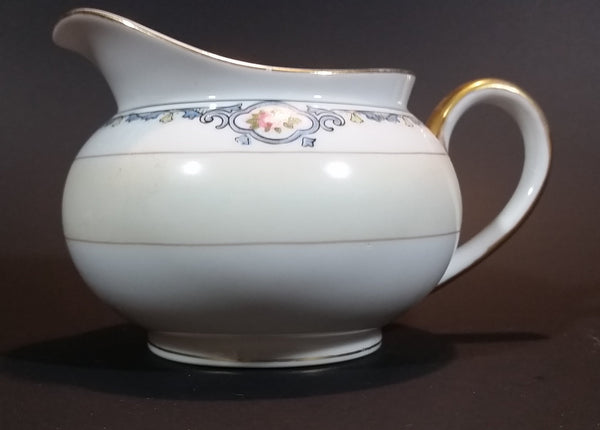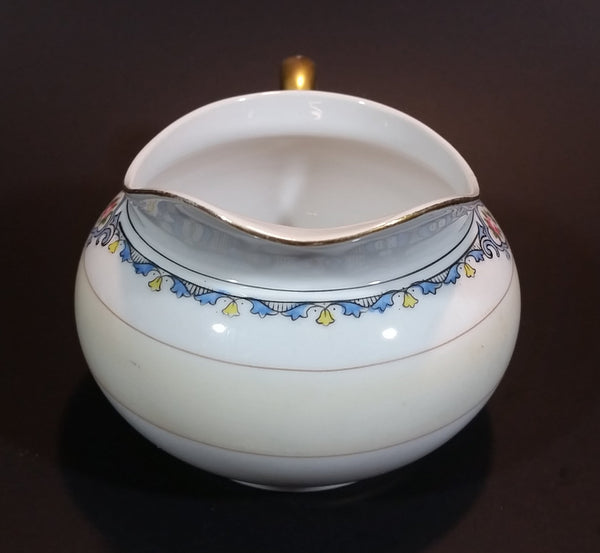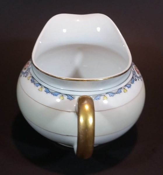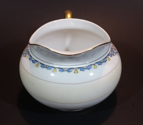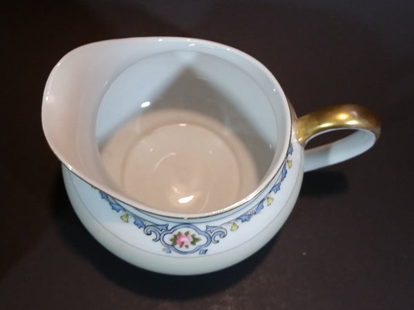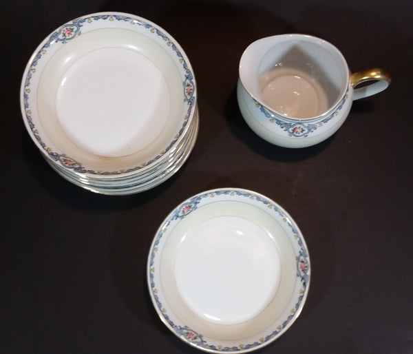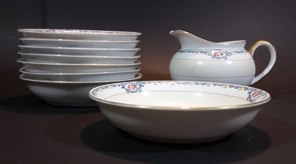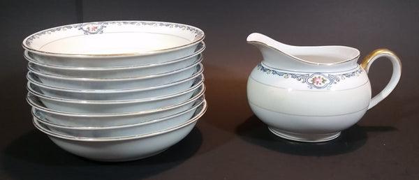 1925 Noritake Made in Japan Blue Floral Bells Pink Rose Gold Trim Creamer with Eight 5 1/4" Bowls