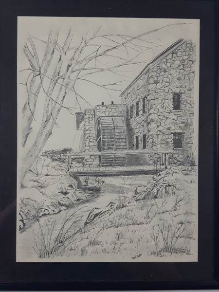 Cobblestone Building with Watermill Wheel 17" x 21" Framed Charcoal Pencil Sketch Signed