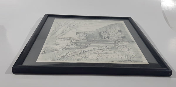 Cobblestone Building with Watermill Wheel 17" x 21" Framed Charcoal Pencil Sketch Signed