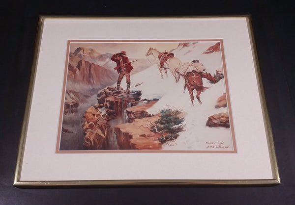 Western snowy hunting scene with a downed mountain sheep, hunter with rifle and his two horse convoy in winter on a cliffs edge. Print of a painting by Marcel Leduc's version as a reproduction of the original Charles Russell painting.