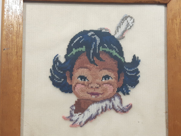Vintage First Nations Native Child 7 1/2" x 7 1/2" Framed Cross Stitch Needle Petit Point Picture