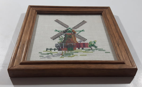 Vintage Dutch Windmill 7 3/8" x 7 3/8" Framed Cross Stitch Needle Petit Point Picture